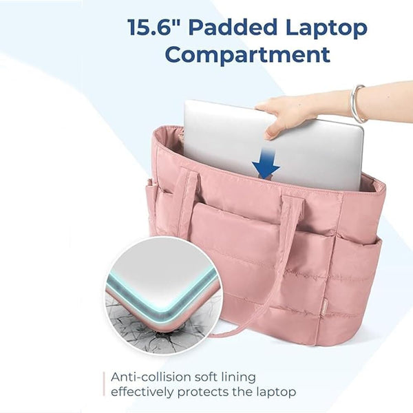Sí, el bolso acolchado tiene espacio suficiente para un portátil de hasta 15 pulgadas, manteniéndolo seguro con su cierre de cremallera.